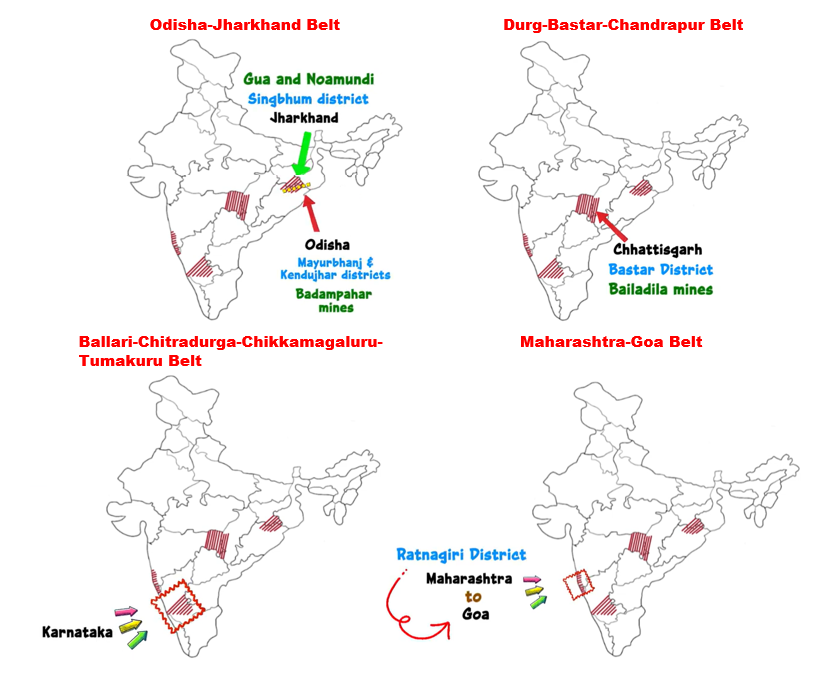 - The major iron ore belts in India are:-