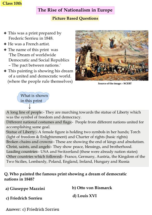 Visuals in this chapter are more than just pictures — they carry important messages from history. This section includes all the key picture-based MCQs from The Rise of Nationalism in Europe . You will learn how to recognize and understand prints, flags, and symbols that show the rise of nationalism in 19th-century Europe.